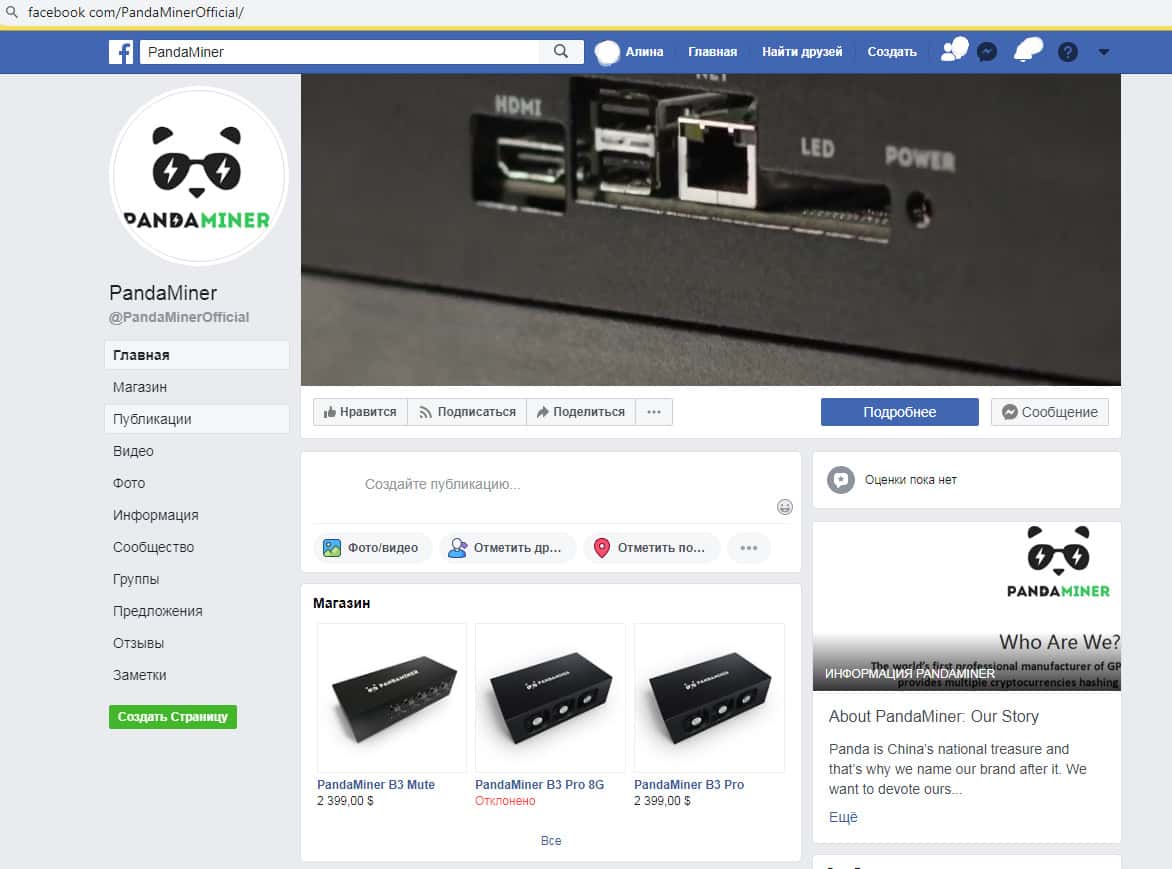Чтобы соответствовать всем современным трендам аферисты Панда Майнер решили обзавестись страницами и в других социальных сетях, например, Facebook. На данной странице у мошенников PandaMiner имеется несколько тысяч накрученных подписчиков, при этом активность в группе снова около нулевая.