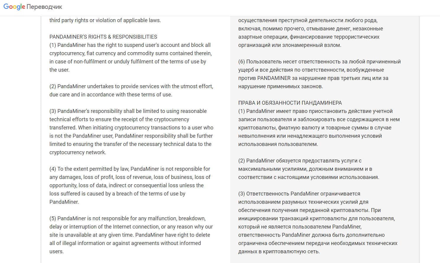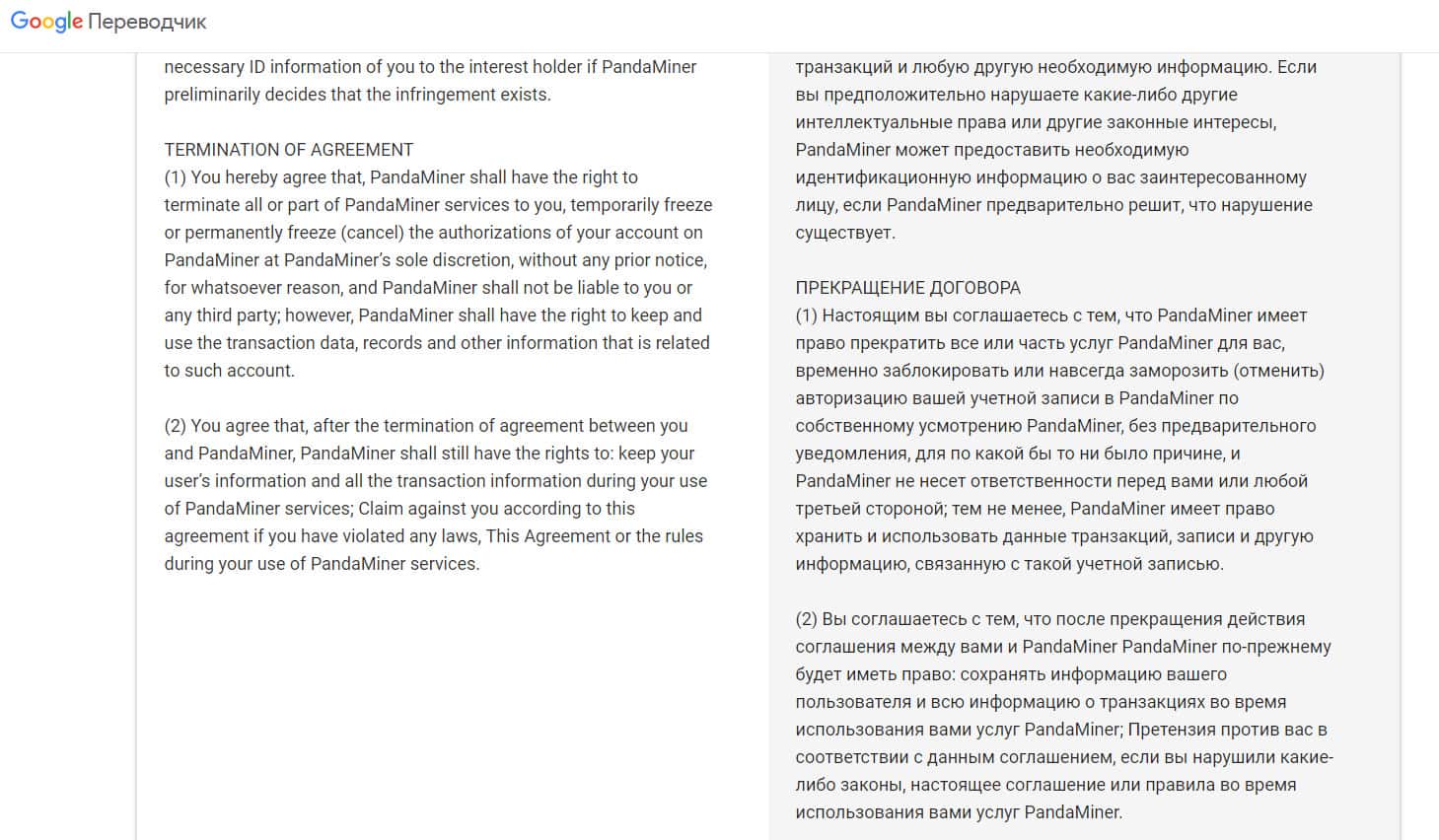На изображении можно увидеть скрин из гугл переводчика одного из разделов клиентского соглашения шулеров PandaMiner. Их кухня вообще оставляет за собой право в любой момент ограничить доступ к своему подвальному сайту или своим услугам без предварительного уведомления или объяснений со своей стороны.
