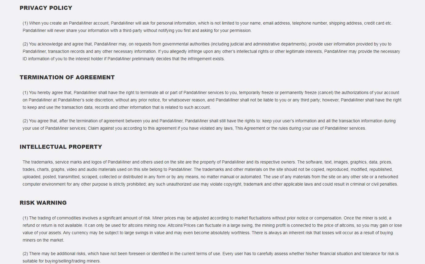 В документе о политике конфиденциальности контора PandaMiner противоречит сама себе, потому что сначала говорит о том, что не будет разглашать данные о клиенте, а потом все же ссылается на какие-то исключения и уже, исходя из этого, может сохранить ее после расторжения договора и нести ответственность, естественно, не будет.