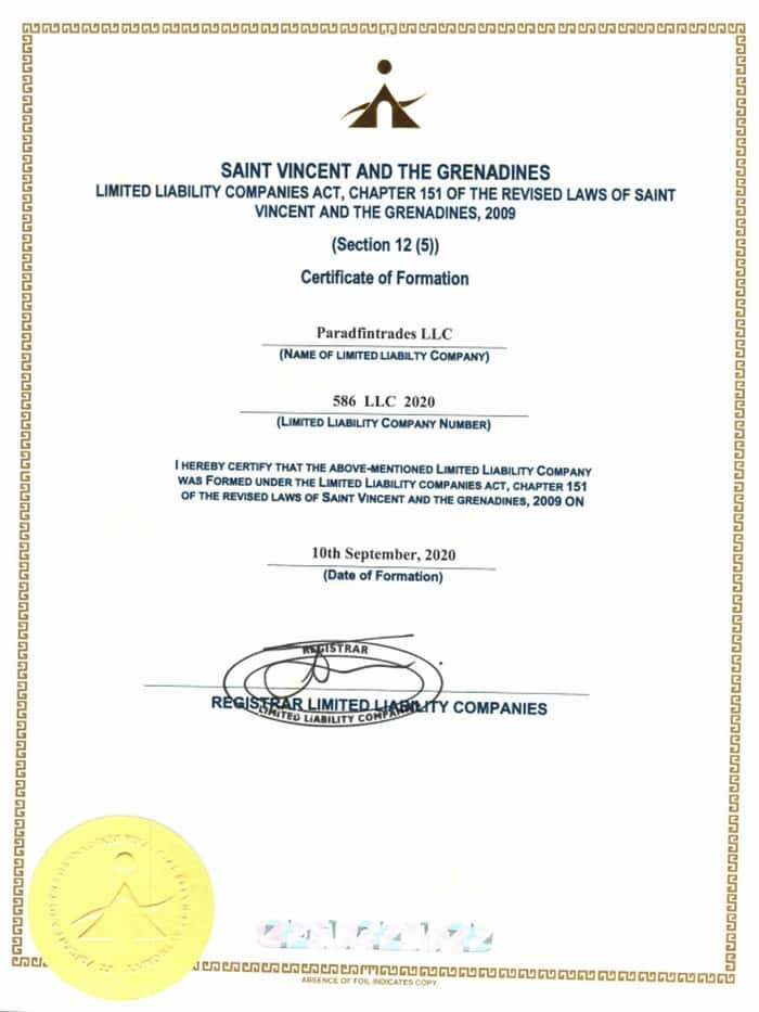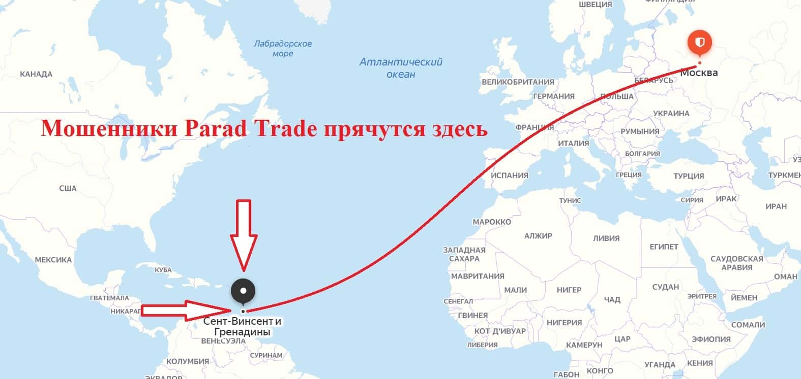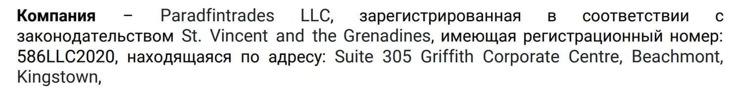 Юридическое лицо, которое указано на сайте псевдо-брокера Parad Trade зарегистрировано в оффшоре, а именно на острове Сент-Винсент и Гренадины.