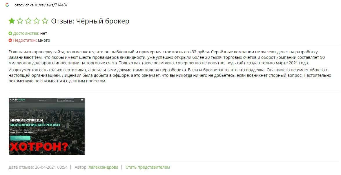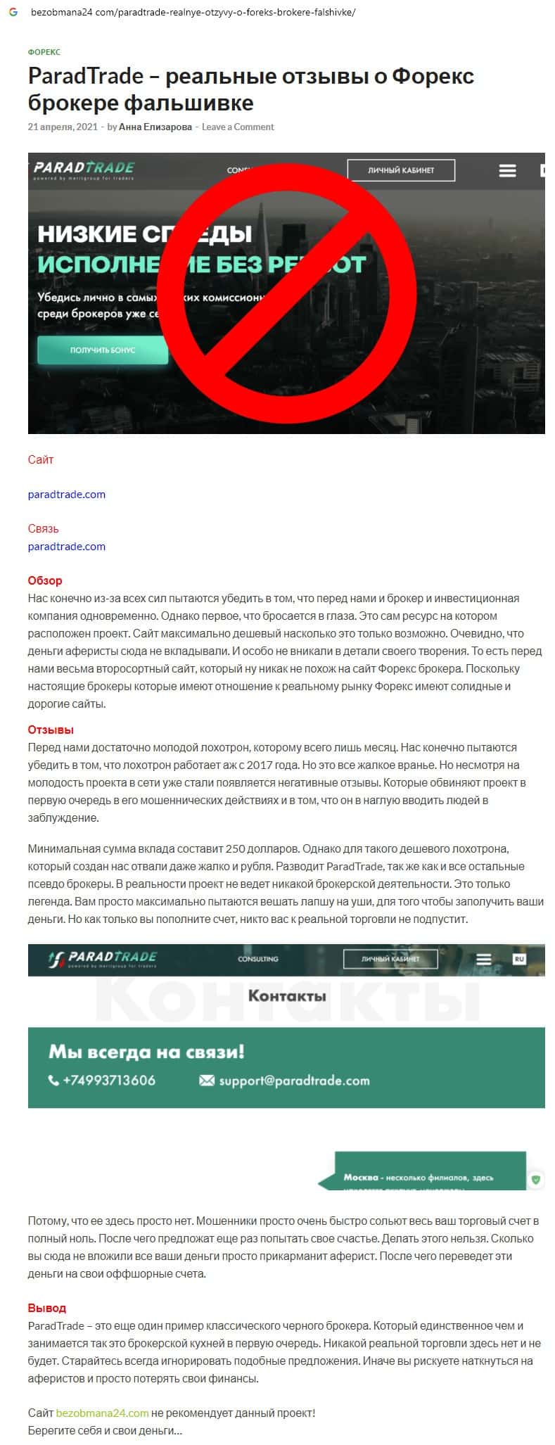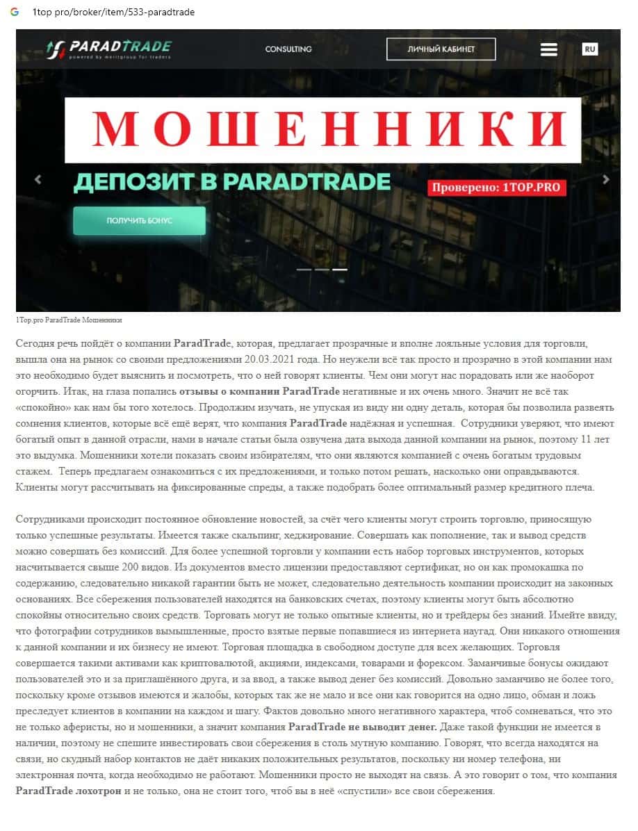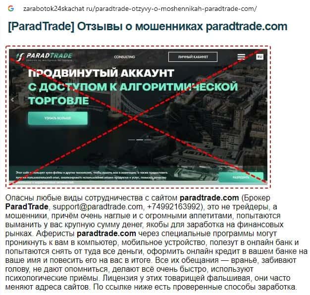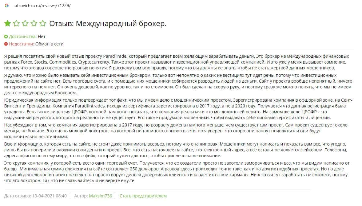 Далее предоставлен еще один обзор, который разоблачает деятельность мошеннической организации Parad Trade, которая предоставляет псевдо-брокерские услуги.