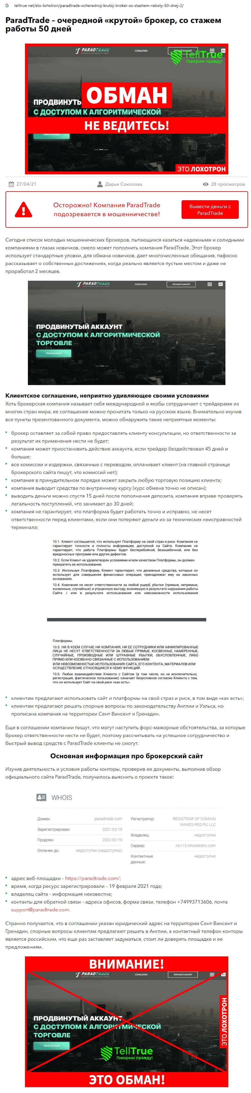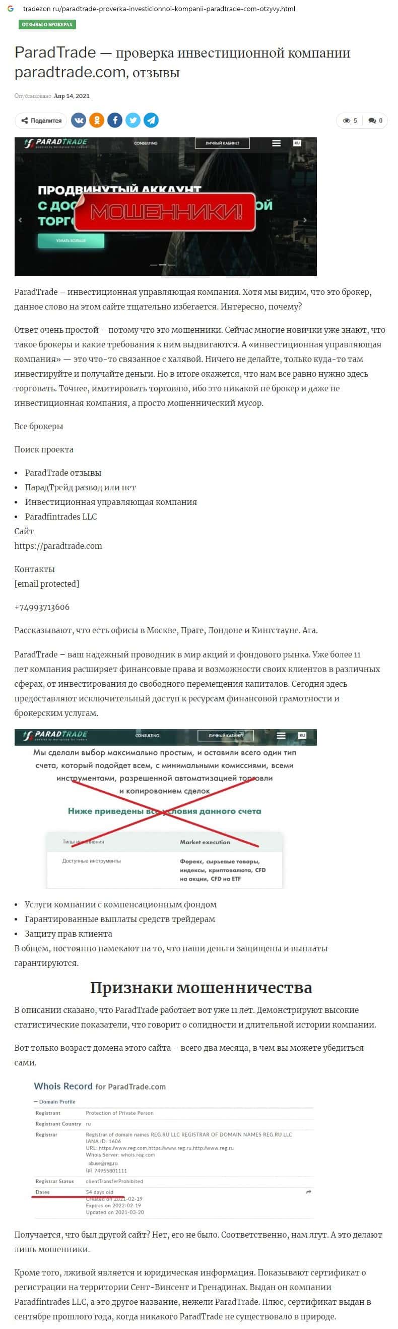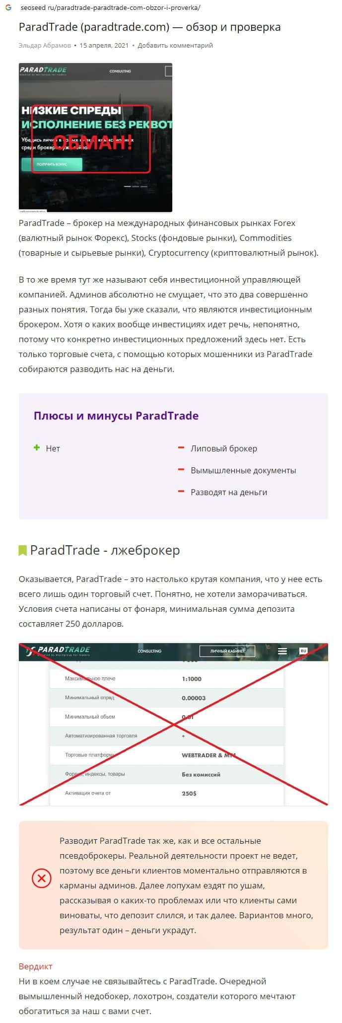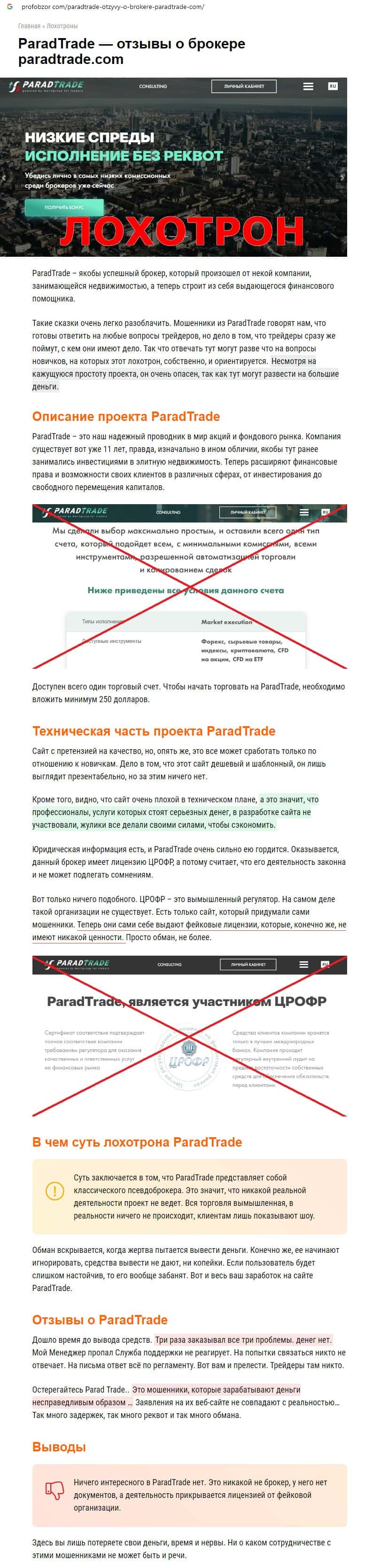 Далее предоставлен еще один обзор, который разоблачает деятельность мошеннической организации Parad Trade, которая предоставляет псевдо-брокерские услуги.