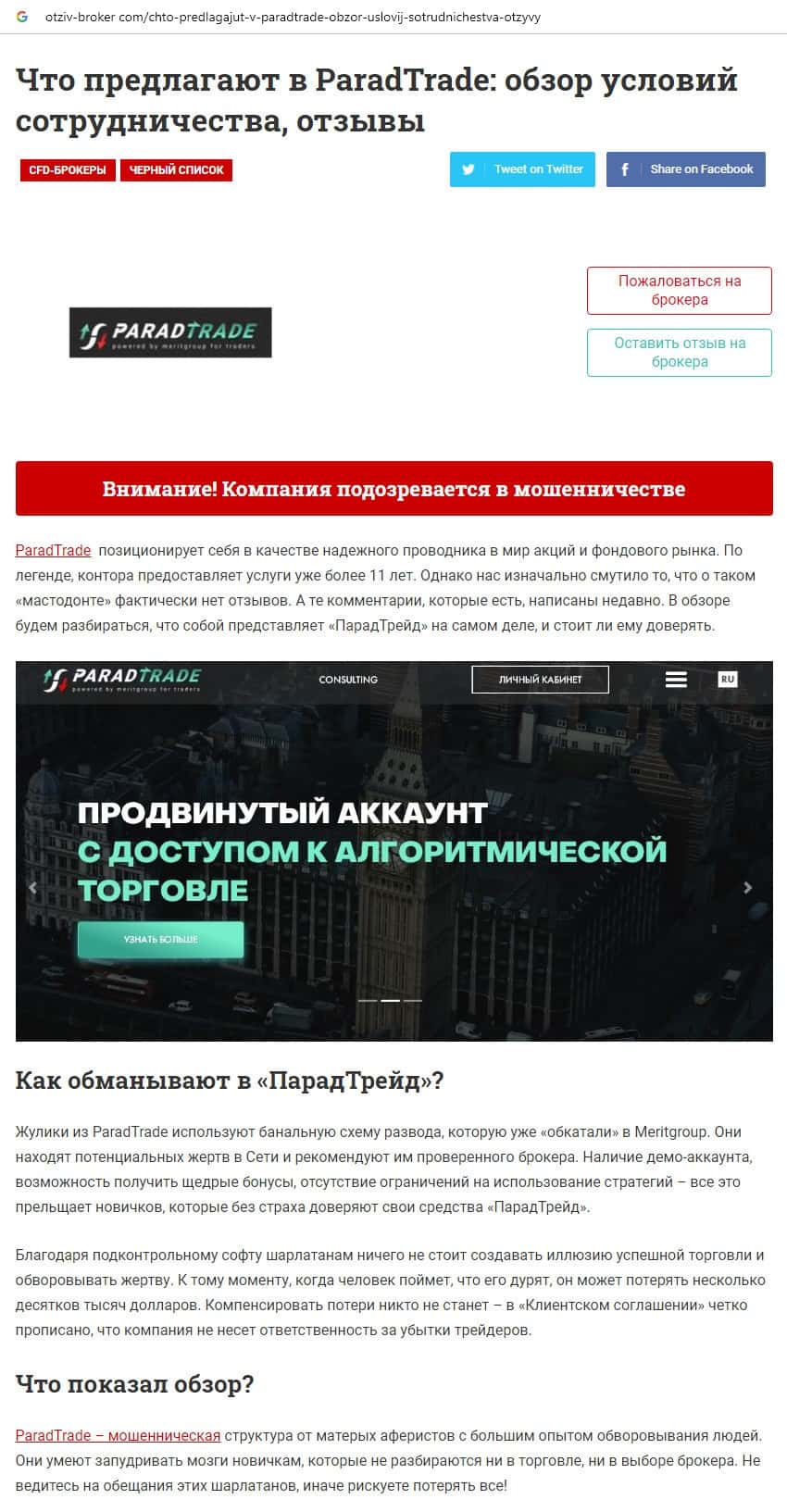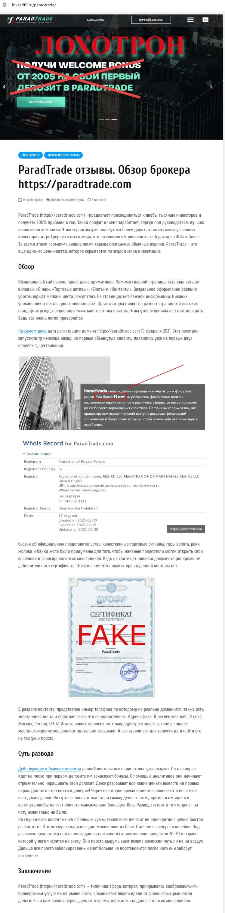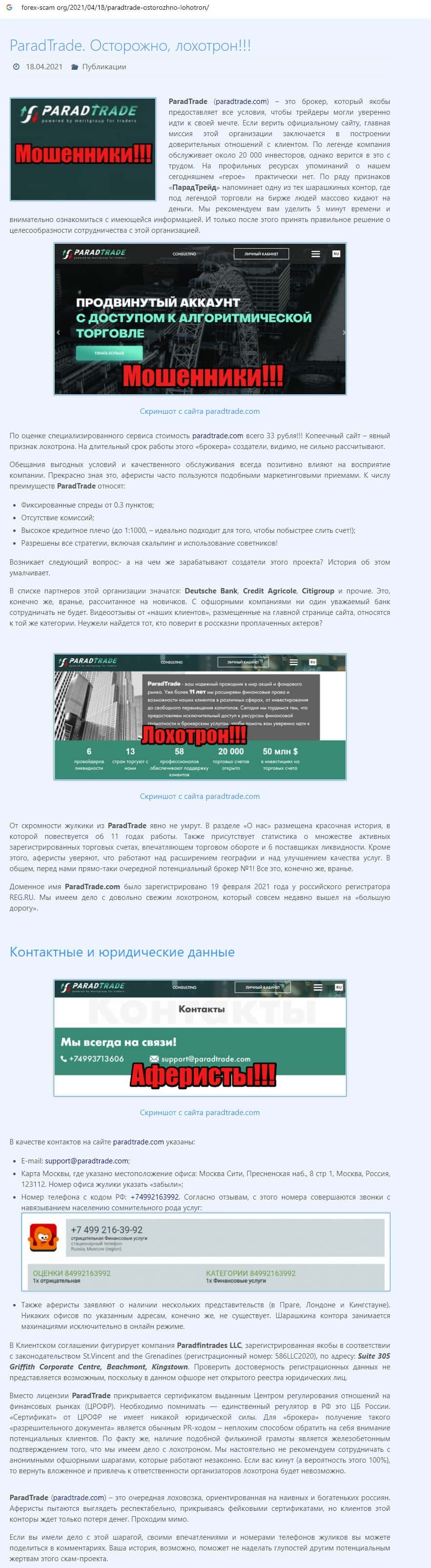 Далее предоставлен еще один обзор, который разоблачает деятельность мошеннической организации Parad Trade, которая предоставляет псевдо-брокерские услуги.