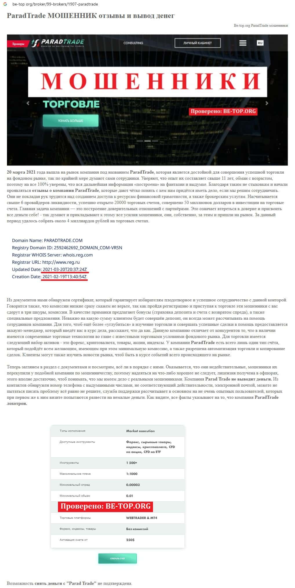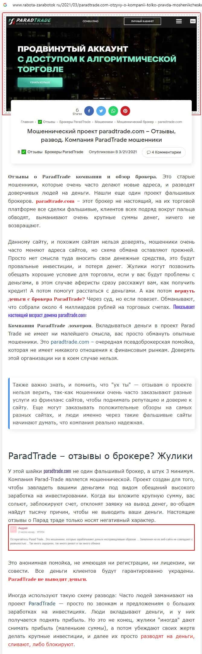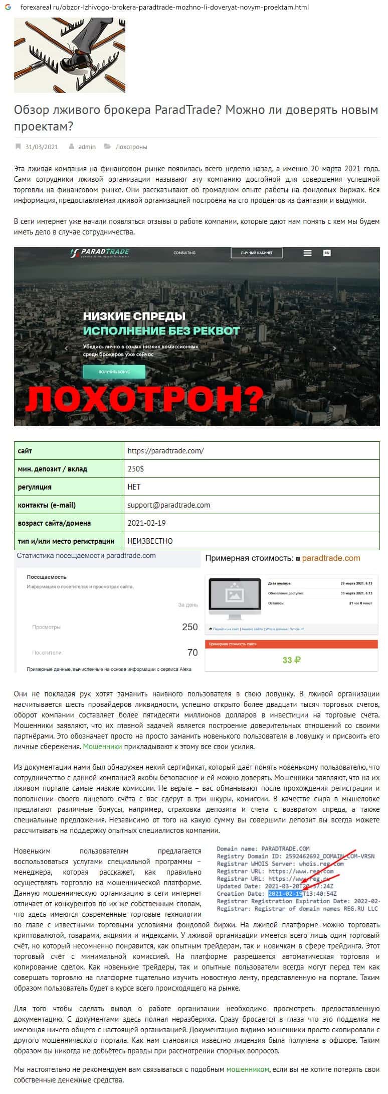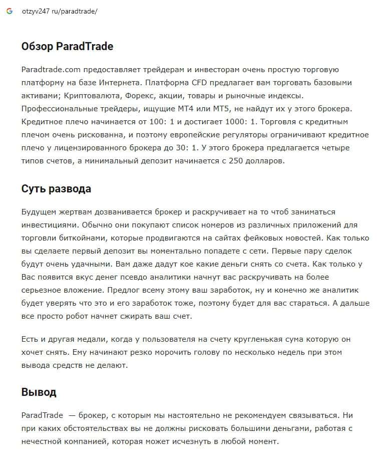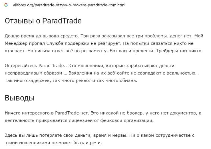 Отзывы о скам-проекте Parad Trade, ныне присутствующие в интернет-сети