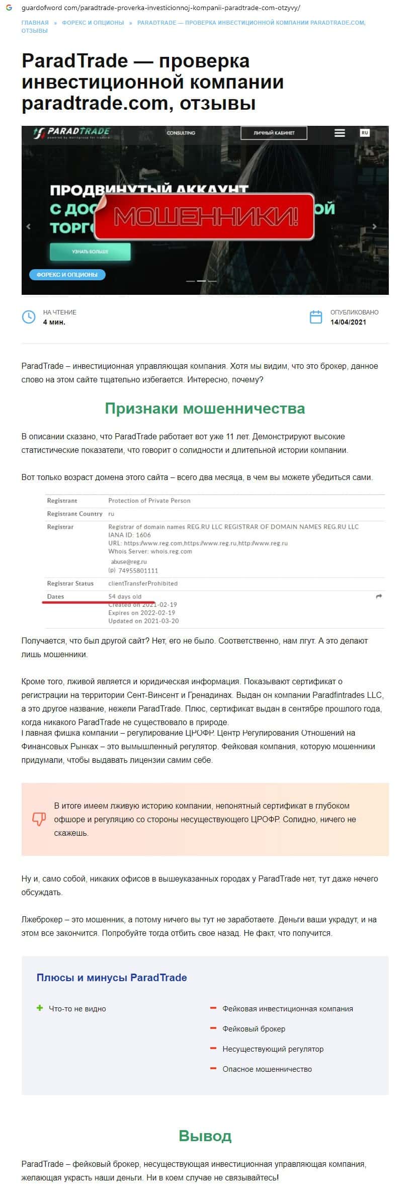 Разоблачение мошеннической компании Парад Трейд представлено далее.