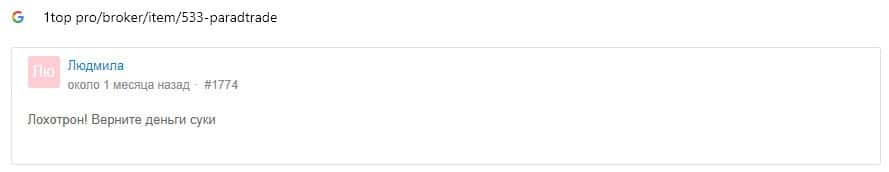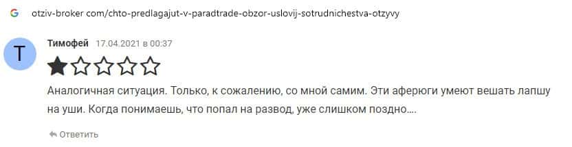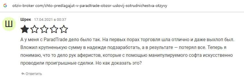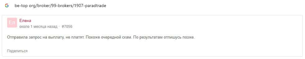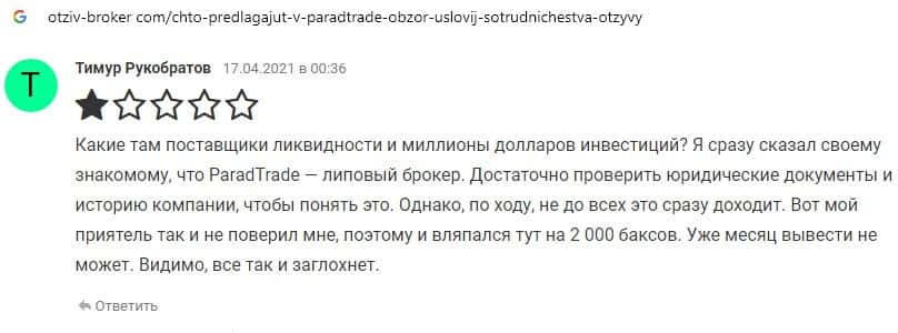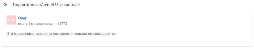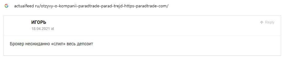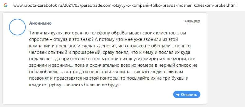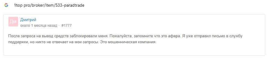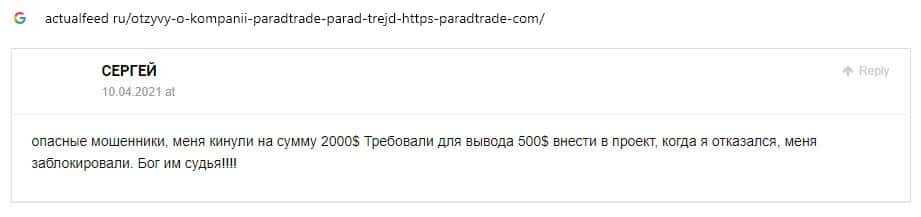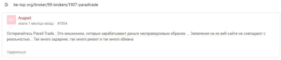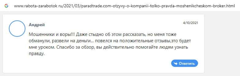 Далее предоставлен еще один комментарий об обманщиках Parad Trade, которым пользователи глобальной сети-интернет не доверяют.