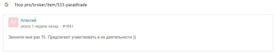 Ниже предлагаем ознакомиться с еще одним отзывом о том, что аферисты Parad Trade пользователю навязчиво названивали, предлагая торговать на их лохотронском сайте.