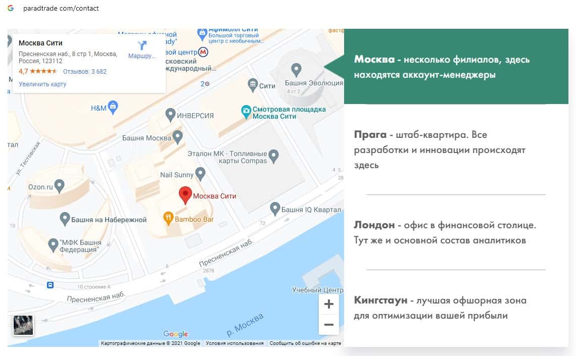 Аферисты Parad Trade на своем веб-сайте предоставляют лживую информацию о своей организации, включая историю возникновения их компании, а также адреса местонахождения.