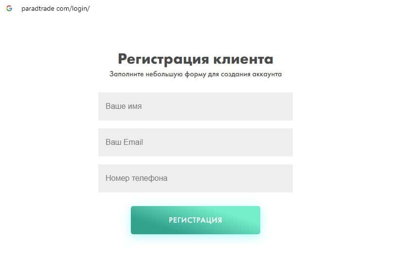 Шулера Parad Trade предлагают пользователям заполнить бланк сбора данных, где просят указать свое имя, адрес электронной почты и номер контактного телефона.