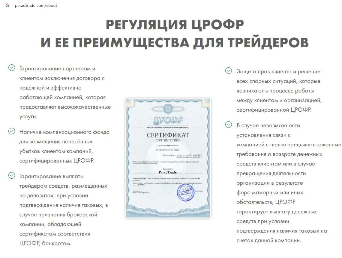 Вместо лицензии обманщики Парад Трейд предоставляют сертификат соответствия выдан аферистами ЦРОФР, которые также являются мошеннической организацией.