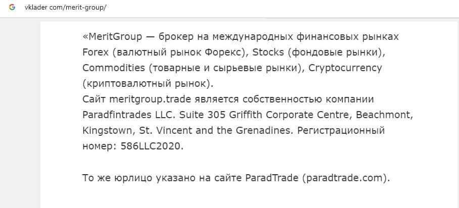На сайтах контор Парад Трейд и Merit Group указано одно и тоже юридическое лицо, что является признаком того, что перед нами одна группа мошенников.