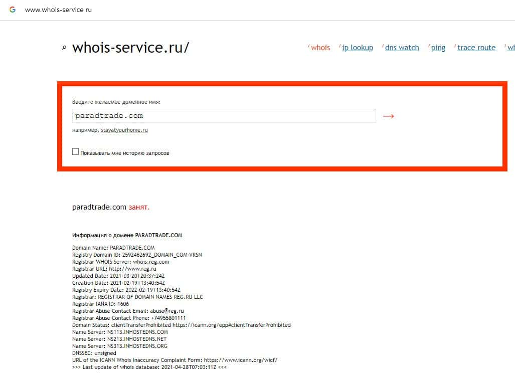 Сервис whois-service ru не может найти информацию о владельце домена сайта мошеннической организации Parad Trade, доверять сайту данной скам-конторы нельзя.