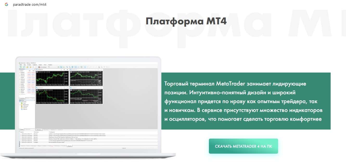 Шулера Парад Трейд предлагают торговать при помощи торговой платформы Мета Трейдер 4, которая разработана мошенниками MetaQuotes для слива денежных средств клиента.
