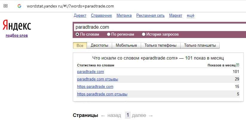 Количество брендовых запросов название домена компании "paradtrade.com" на Яндекс Вордстарт составляет 101 запрос за месяц.
