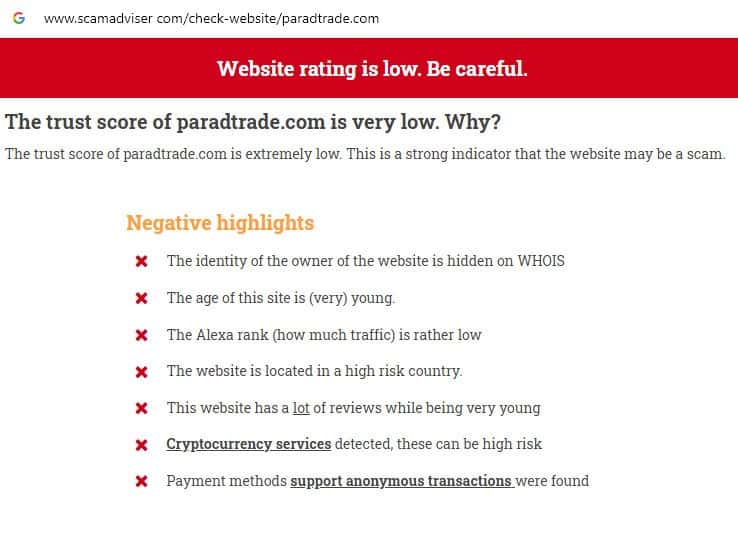 Проверка Parad Trade на сайте scamadviser com показала, что у данного сайта низкий рейтинг, а также выявлено множество отрицательных моментов в работе сервера.