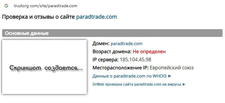 Проверка интернет-портала шулеров Парад Трейд на trustorg com показала, что возраст домена определить невозможно, мы имеем дело с очередным интернет-лохотроном.