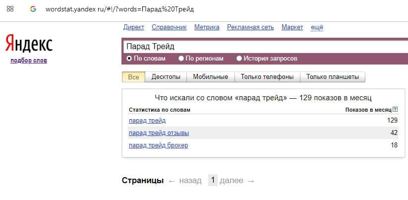 Количество запросов по бренду названия компании на русском языке "Парад Трейд" на Вордстарт Яндекс Ру составляет 129 показов за месяц.