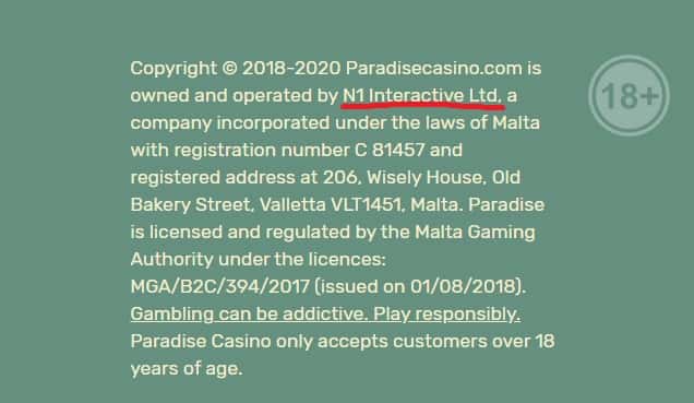 На сайте казино ParadiseCasino есть информация, что данная контора принадлежит и управляется компанией N1 Interactive Ltd, зарегистрированной на Мальте.