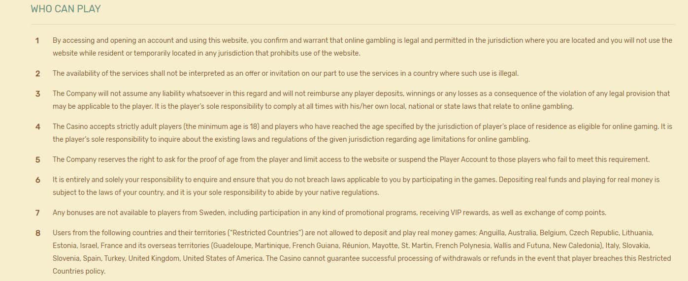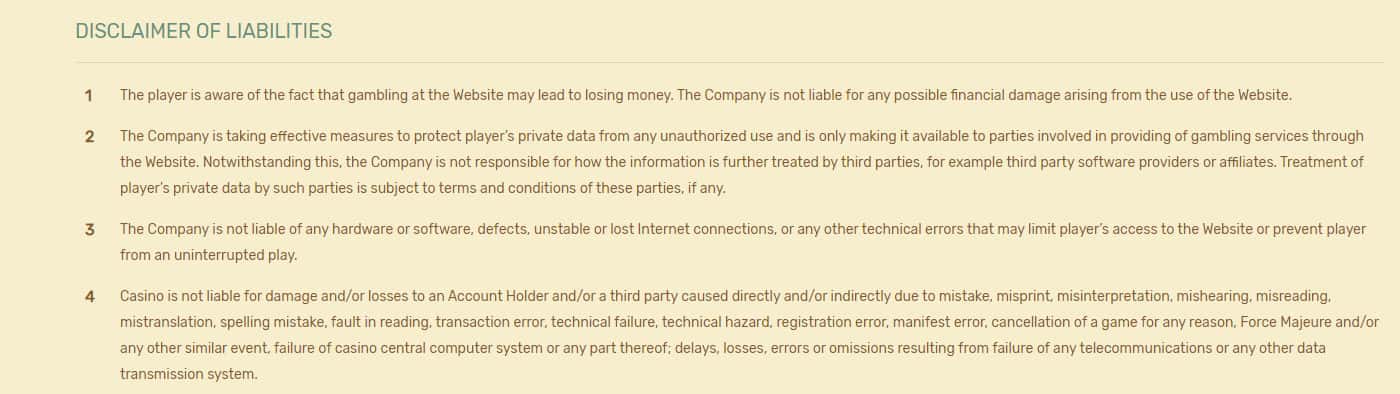 В пункте Отказ от ответственности пишется, что игрок осознает тот факт, что азартные игры на сайте могут привести к потере денег. Компания не несет ответственности за любой ущерб.
