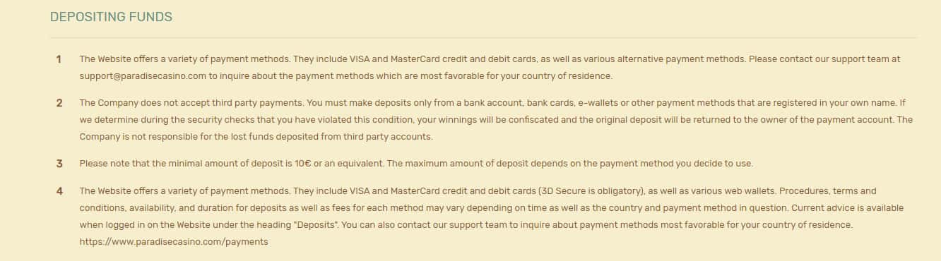 Также в нем указано, что компания ParadiseCasino не несет ответственности за потерянные средства, депонированные со счетов третьих лиц.
