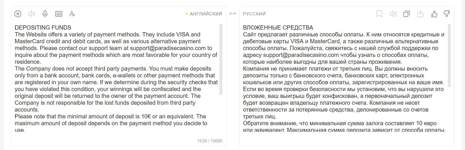 Ниже представляем вашему вниманию полный текст договора компании Парадайс Казино с клиентом в переводе на русский язык.