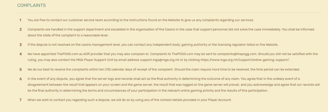 В разделе договора Жалобы описано, каким образом должен действовать клиент, если у него имеются жалобы на работу казино.