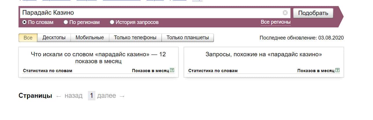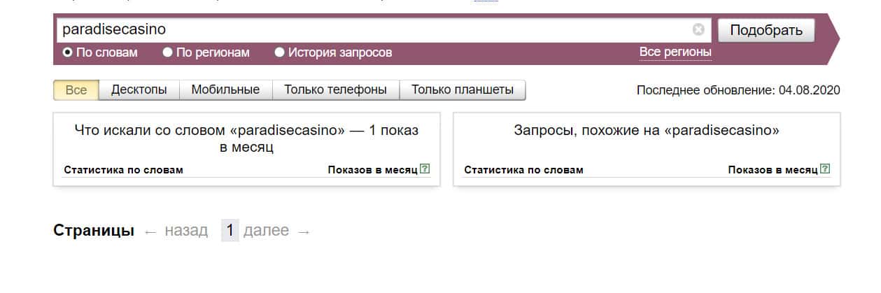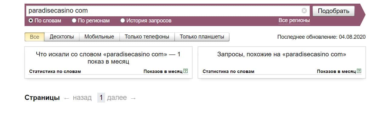 Название бренда "paradisecasino" на английском языке пользователи искали в системе Яндекс аналогичное количество раз: 1 показ за месяц.