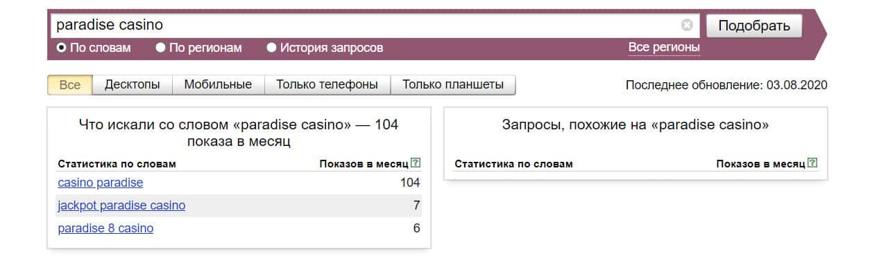 Количество запросов по бренду "paradise casino" на английском языке с пробелом довольно большое. Его набирали в поисковике Яндекс 104 раза - крайне мало.