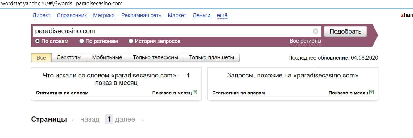 Количество запросов по доменному имени "paradisecasino com", написанного с пробелом, по данным сервиса Яндекс Вордстат, равно такой же цифре - 1 показ.