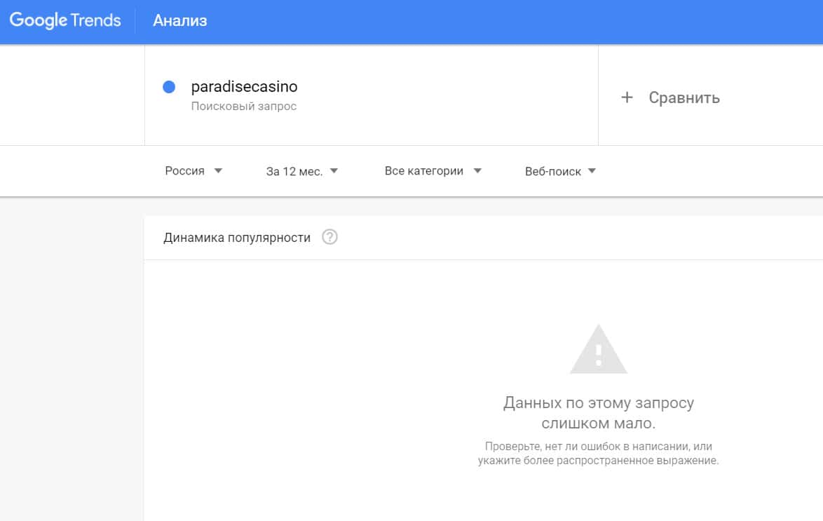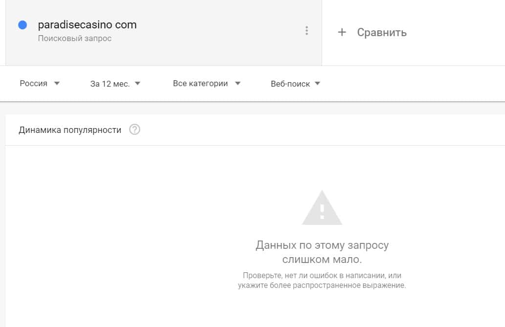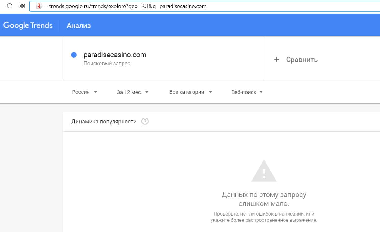 Запросы от пользователей по доменному имени "paradisecasino com" в сервисе Гугл Тренд поступали очень редко.