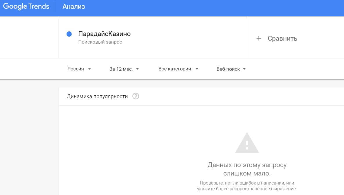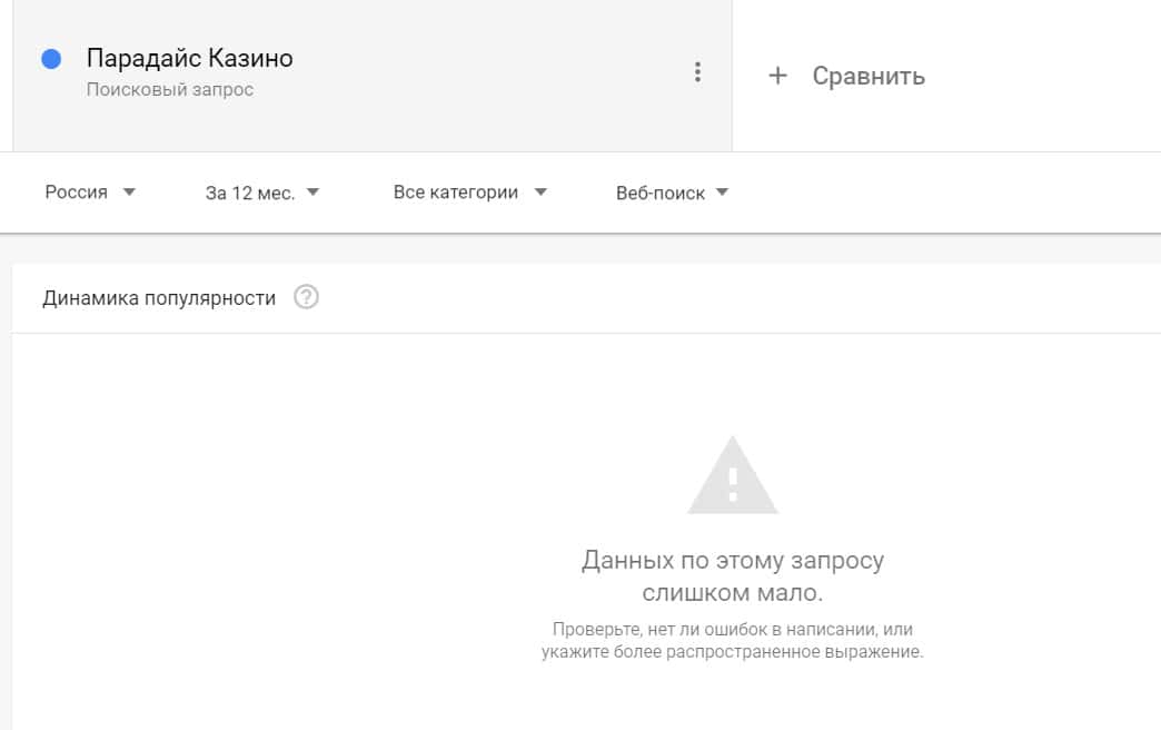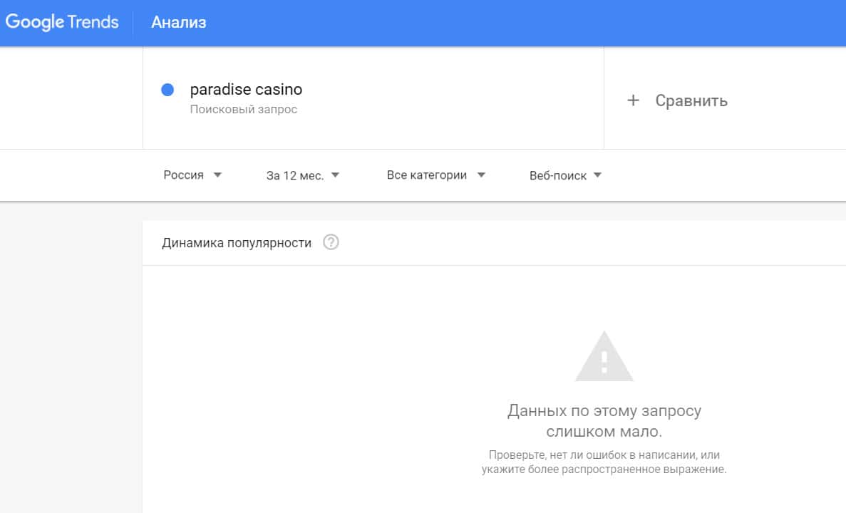 Название бренда "Парадайс Казино" на русском языке искали в системе Гугл мало пользователей.