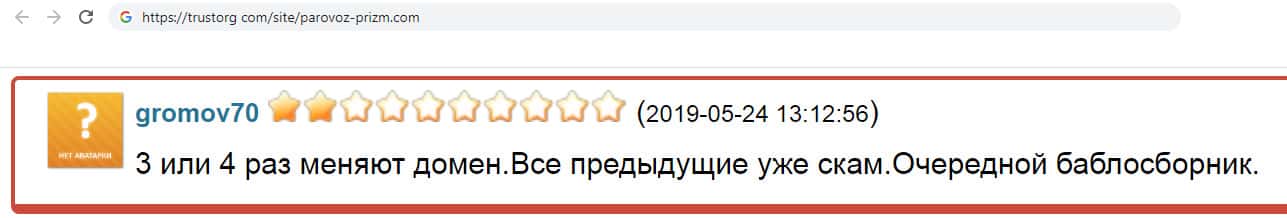 На одном из интернет ресурсов пользователь оставил отзыв о мошенниках Parovoz-Prizm. Он сказал, что это очередной баблосборник, так же он рассказал о том, что контора три или четыре раза меняли домен, а предыдущие домены уже слиты из за мошенничества, но контора создала новый, что бы продолжать доить наивных пользователей.