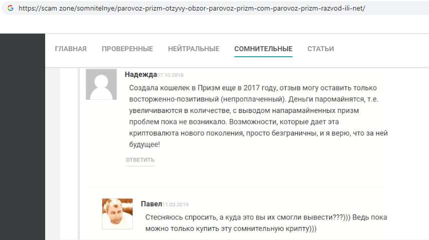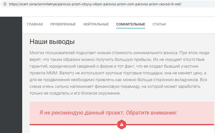 scam zone - интернет ресурс с отзывами о жуликах Паравоз Призм
