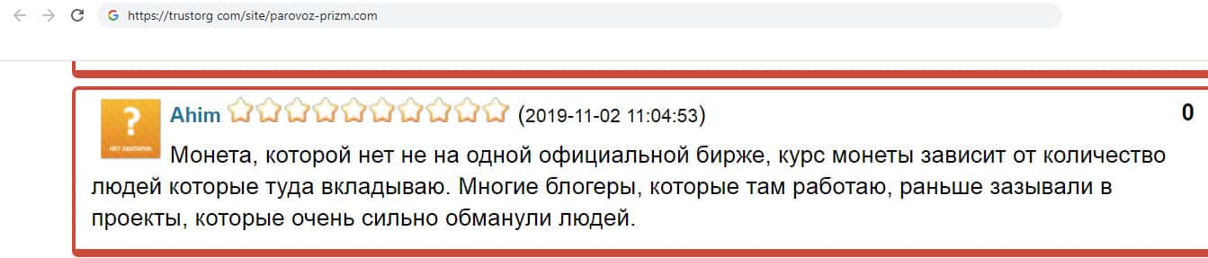 В данном отзыве пользователь высказался по поводу махинаторов Паравоз Призм. Он рассказывает, что мошенники продают клиентам монету, которой нет ни на одной официальной бирже, так же курс монеты зависит от количества инвесторов. Так же блогеры, которые зазывают в проект сотрудничали с мошенниками, которые ранее уже развели большое количество людей.