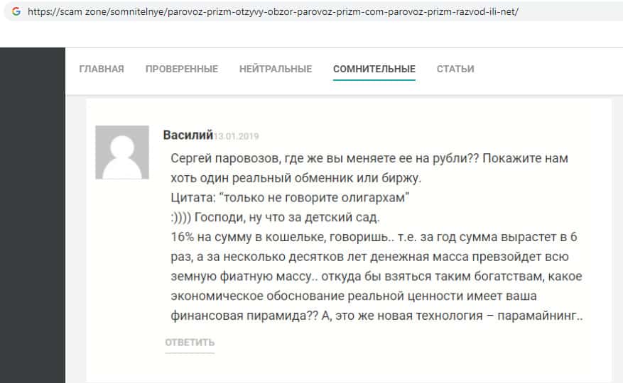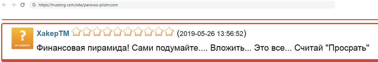 Один из пользователь в своём отзыве о мошеннической организации Parovoz-Prizm указал, что это финансовая пирамида. Он так же призывает людей задуматься о том, что они вложат деньги и больше их не увидят, клиенты просто добровольно и безвозвратно отдают свои денежные средства в руки жуликов.