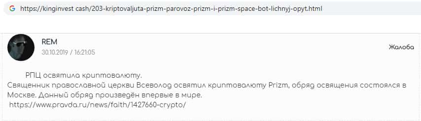 Данный отзыв напечатал наверное один из самых неадекватных пользователей. Этот отзыв даже нельзя назвать заказным, так как компания врят ли будет платить за такое... Он сообщает, что некий Всеволод, который является священником православной церкви, освятил крипту мошенников Parovoz-Prizm, и обряд был первым в мире, и произошёл в Москве.
