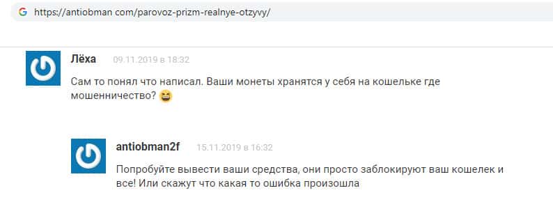 Сотрудники мошеннической фирмы Parovoz-Prizm очень хорошие ораторы, и умеют промывать людям мозги, так, как это произошло с данным пользователем, он яро отстаивает интересы фирмы на форму, постоянно повторяя фразы, которыми фирма его приманила. Он говорит, что деньги хранятся на его кошельке, а не в компании, но другой пользователь объясняет ему, что вывести он их не сможет.
