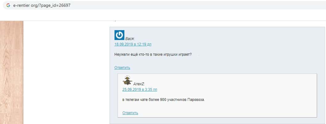 О дном из отзывов пользователь задался вопросом, о том, что неужели ещё кто то играет в такие игрушки? Он не может поверить, что существуют люди, которые всё ещё верят в заработок от фирмы такого рода. Ему ответили тем, что в чате телеграмма более 900 участников. и всех этих людей мошенники Паравоз Призм разводят на деньги.