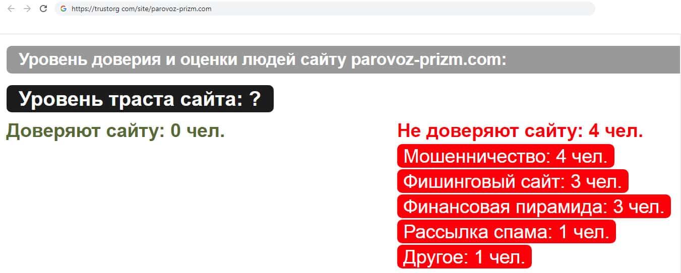Интернет ресурс "Доверие в сети" занимается проверкой сайтов на наличие мошеннической деятельности, и фирма лохотронщиков Parovoz-Prizm не прошла проверку, так как сайт обвиняют в мошенничестве, так же сайт отнесли к фишинговым сайтам, финансовой пирамиде, обвинили в рассылке спама и ещё одной неуказанной причине.