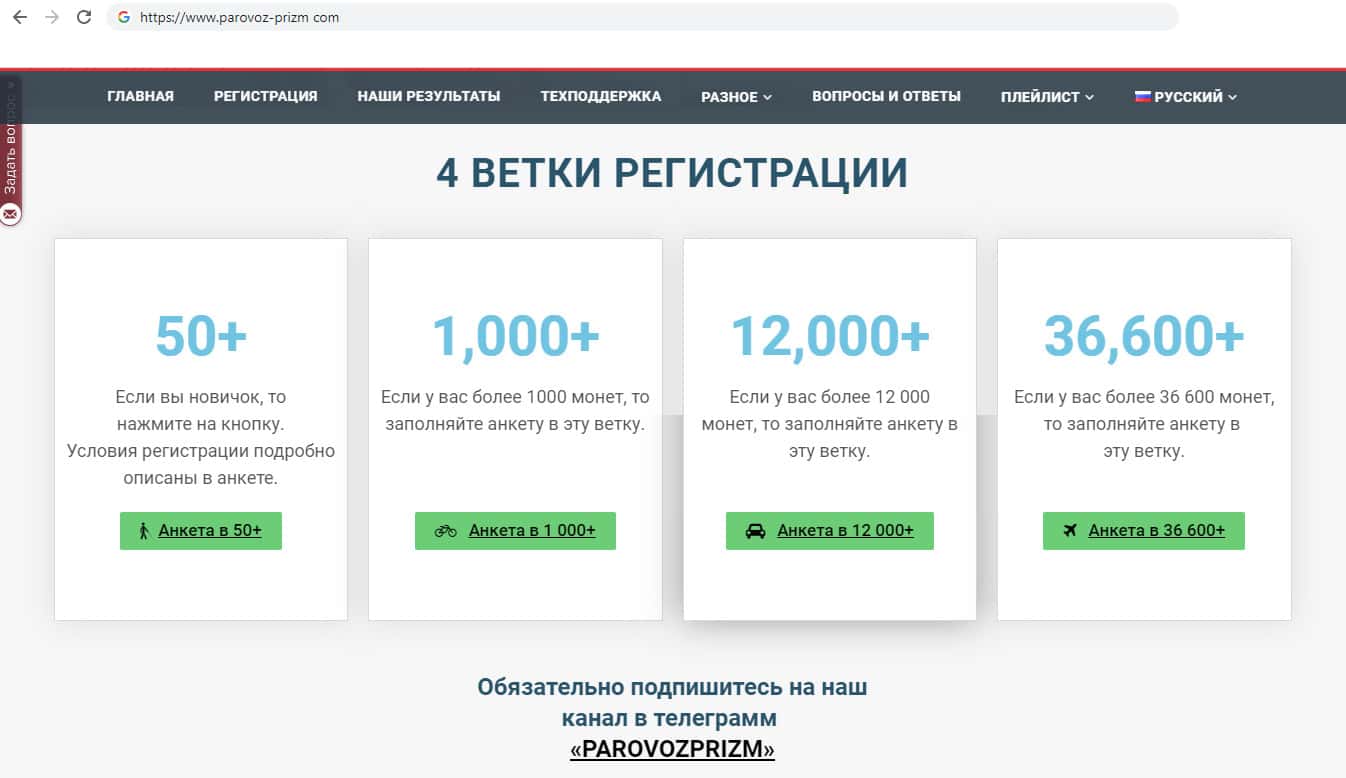 На своём интернет ресурсе мошенники Паравоз Призм предоставили пользователям на выбор 4 ветки регистрации. Регистрация в проекте платная. Первая ветка для новичков, стоимостью 50 монет, вторая 1000 монет, третья 12000 и последняя 36000. Уже с момента регистрации аферисты начинают обворовывать пользователей.