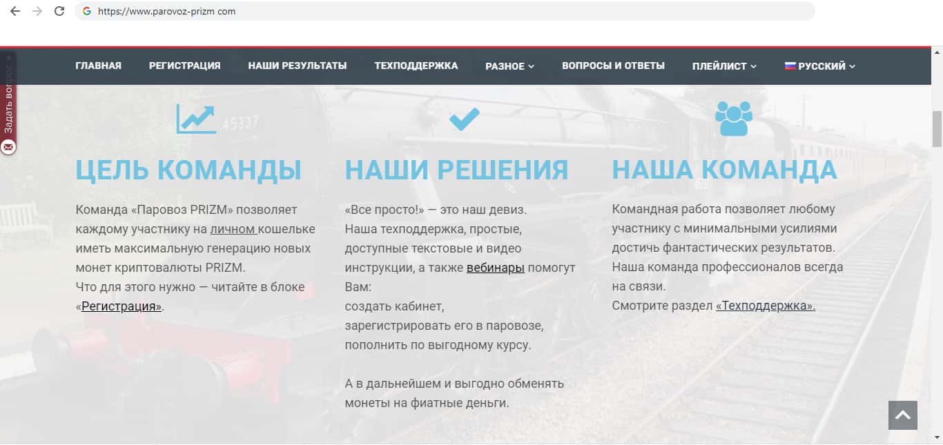 Далее компания начинает рассказывать о своей деятельности, и естественно правды в их словах мало. Жулики Паравоз Призм указывают, что фирма позволяет иметь клиенту в своём кошельке большое количество монет компании, так же компания хвалит сотрудников, которые помогают пользователям в регистрации и достичь им крупного заработка.