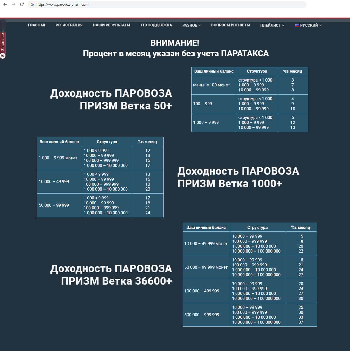 Так же фирма демонстрирует доходность своего мошеннического проекта Паравоз Призм. Компания указала таблицу, на которой можно посмотреть сколько вы заработаете вложив разные суммы на разный срок. Конечно нарисовала компания заманчивые цифры, и из за такой информации пользователи и ведутся на кидал, думая, что реально столько смогут заработать.