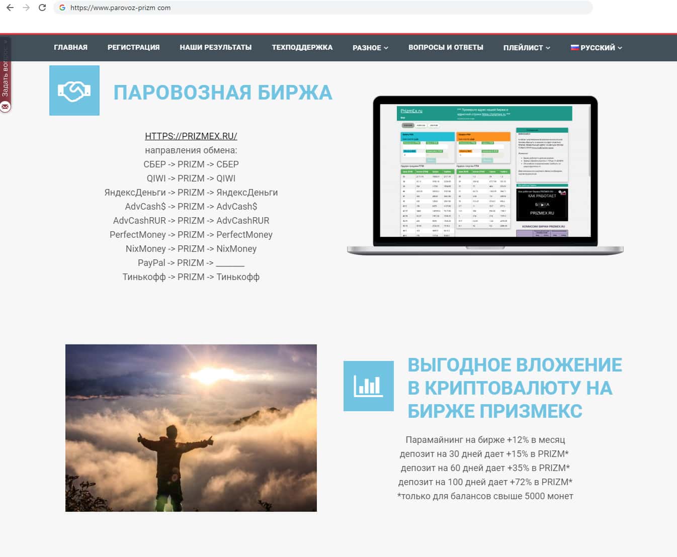 Главный интернет ресурс компании карманников Паравоз Призм выполнен в ярком стиле. Вся информация на сайте сделана для того, что бы приманивать неопытных пользователей, которые глядя на это изобилие красок забудут о всё и компания будет промывать им мозги. тем самым заставляя инвестировать в их фирму.