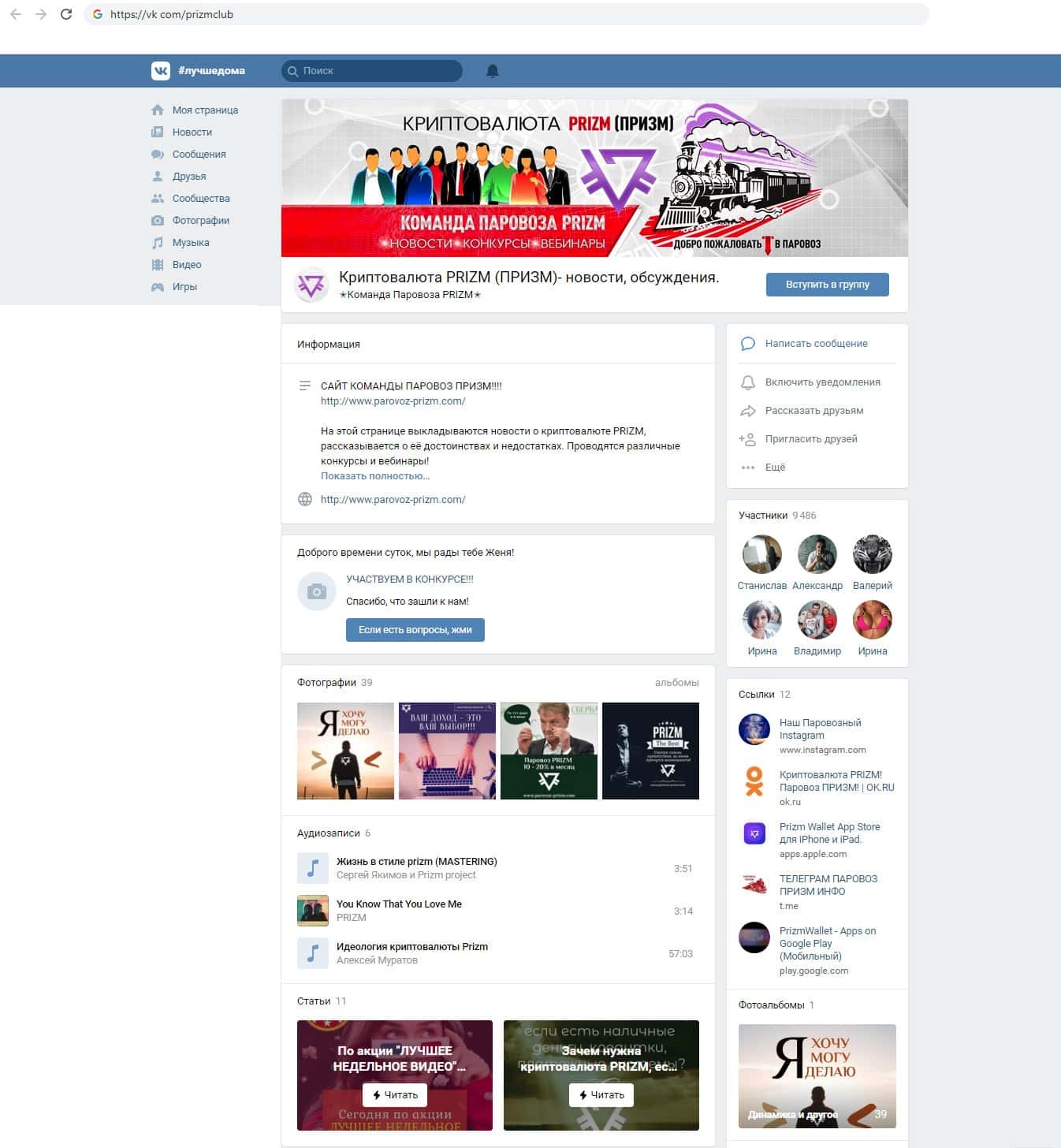 Так же у разводил Parovoz-Prizm есть аккаунт в Вконтакте, одной из самой популярной социальной сети на территории России и Украины. Там мошенники собрали 9465 подписчиков, число которых накручено, так как в чате состоит более двух тысяч, а здесь более 9 тысяч, вопрос, где тогда остальные семь тысяч человек?