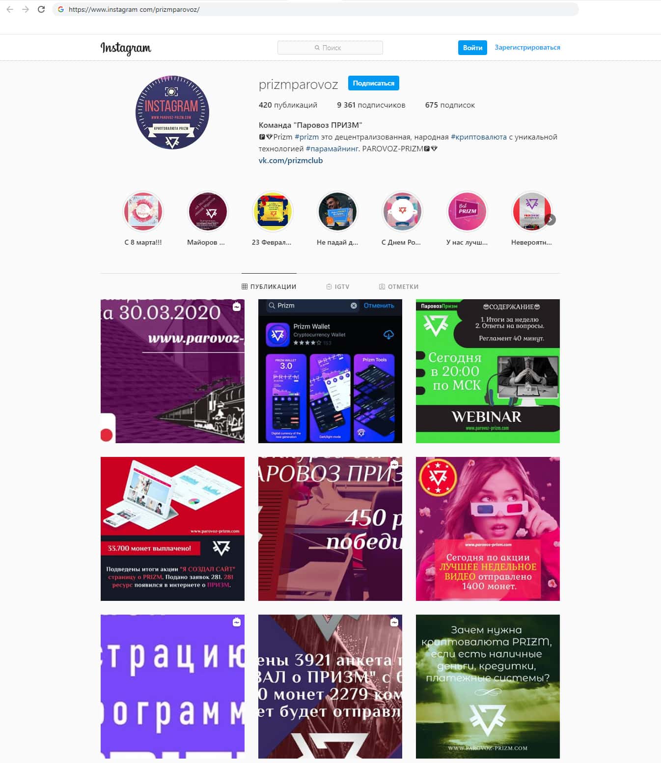 Самый популярный фотохостинг в мине - инстаграмм, так же не остался без внимания аферистов Паравоз Призм. Там они набрали 9361 подписчика. Это очень странная цифра, так как она совпадает с другими аккаунтами компании в социальных сетях. Видимо разводилы заплатили за одинаковое число подписчиков на всех социальных сетях.