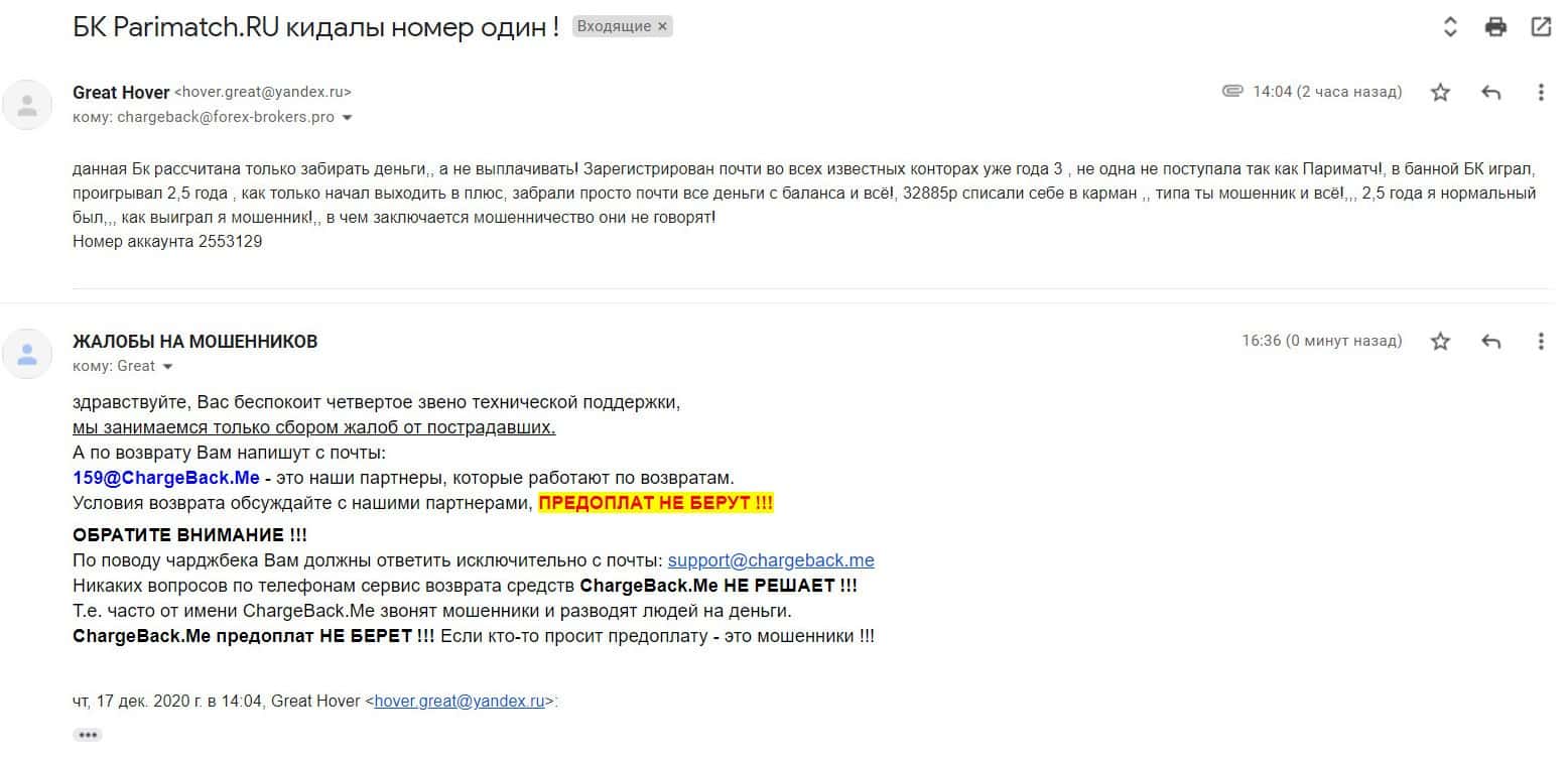 На почтовый адрес сайта по сбору информации о деятельности мошенников форекс пришла жалоба от одного пострадавшего клиента шараги Пари Матч.
