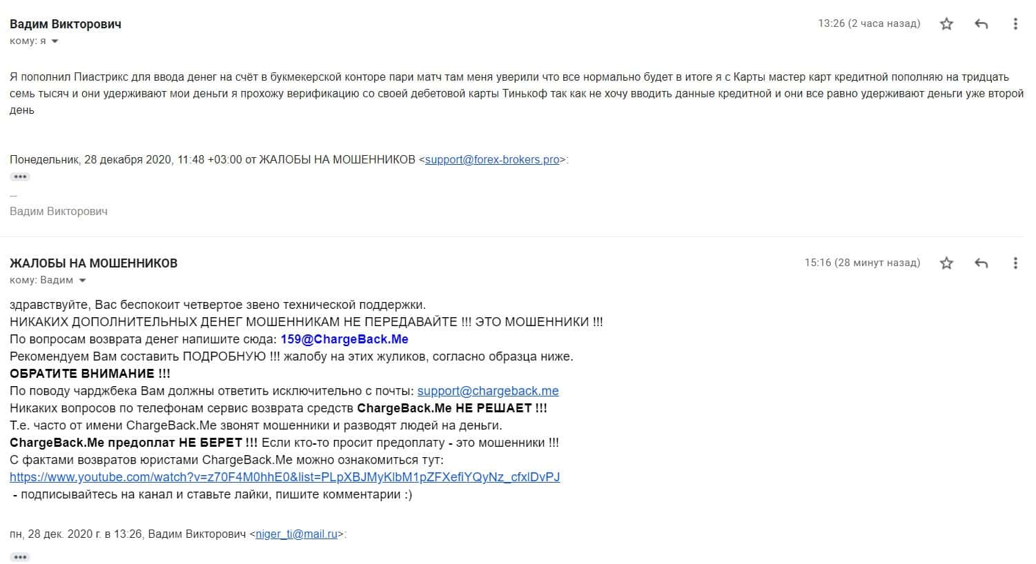 В этом разделе представлена информация от интернет-пользователя, которого обманули аферисты Piastrix и букмекерская контора ПариМатч.