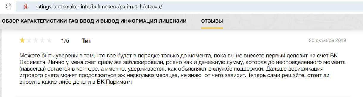 Отзыв Владимира говорит о том, что жулики Пари Матч тупо блокируют счет, и не дают забрать даже свои деньги, которые изначально внес на эту мошенническую площадку.