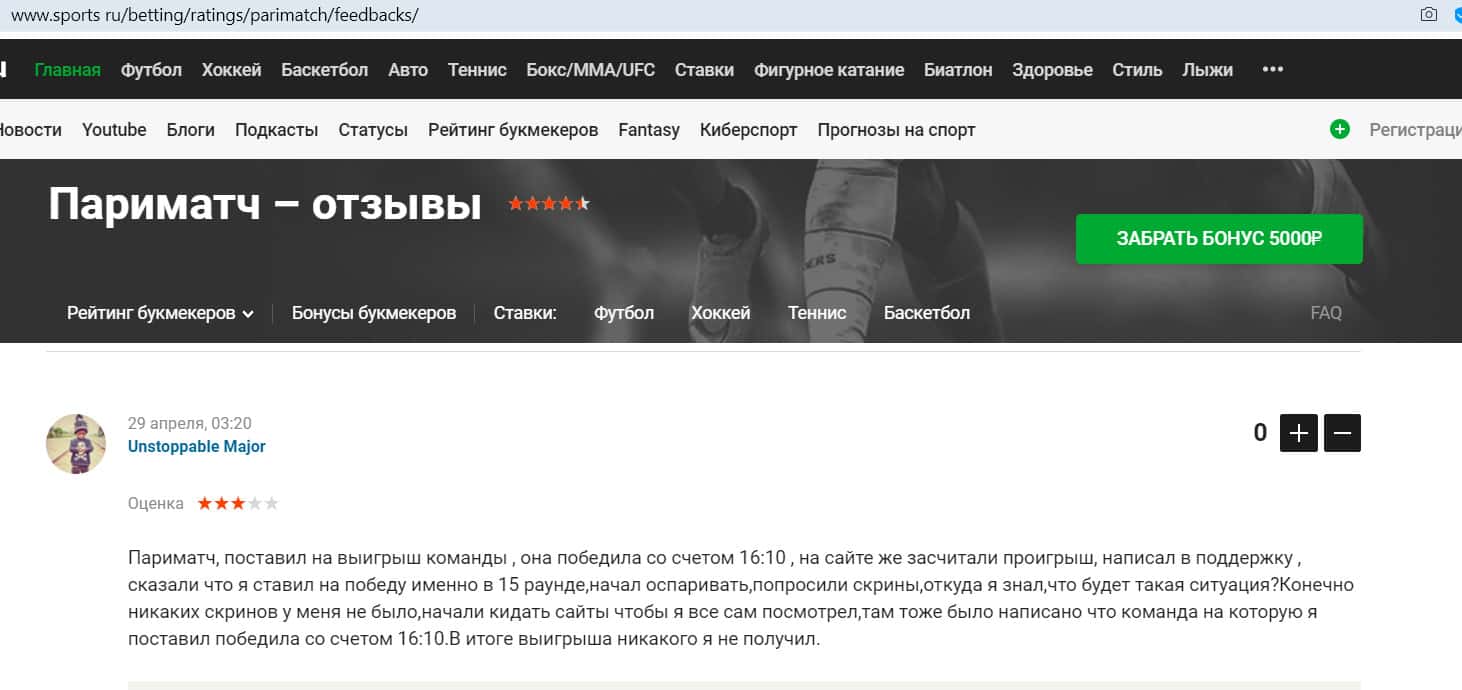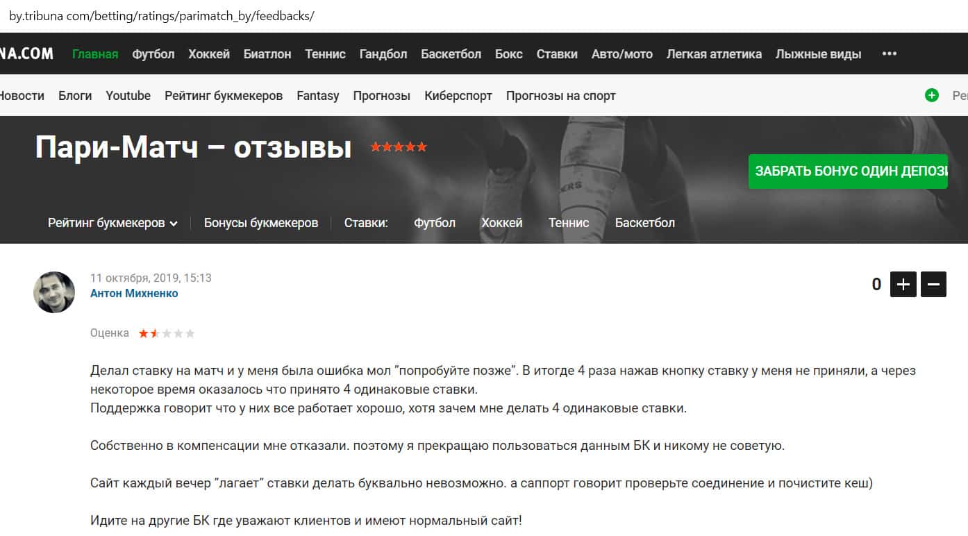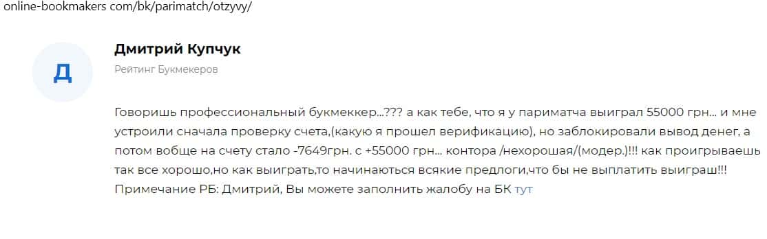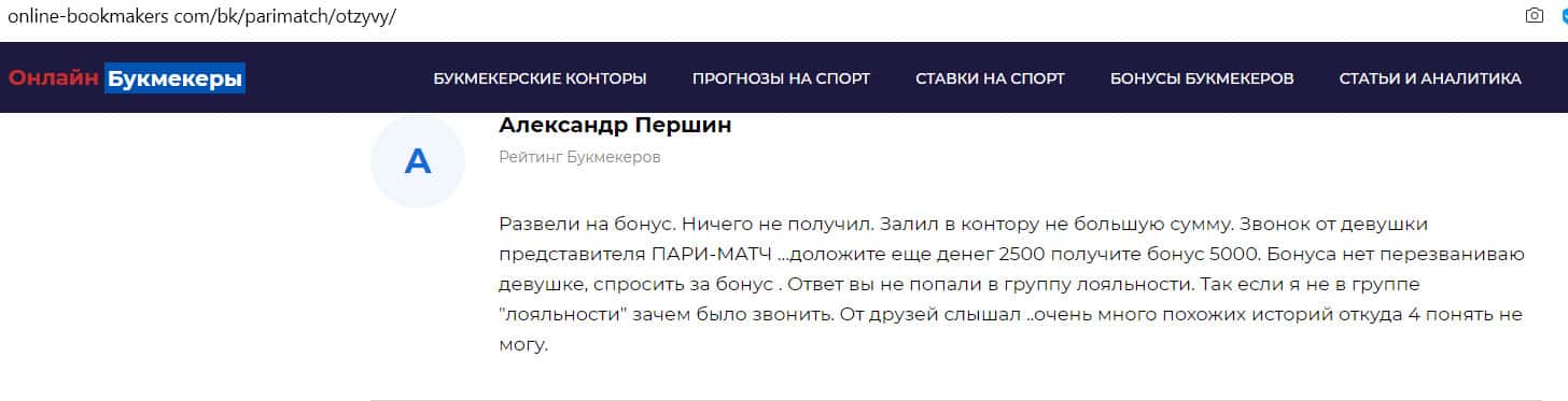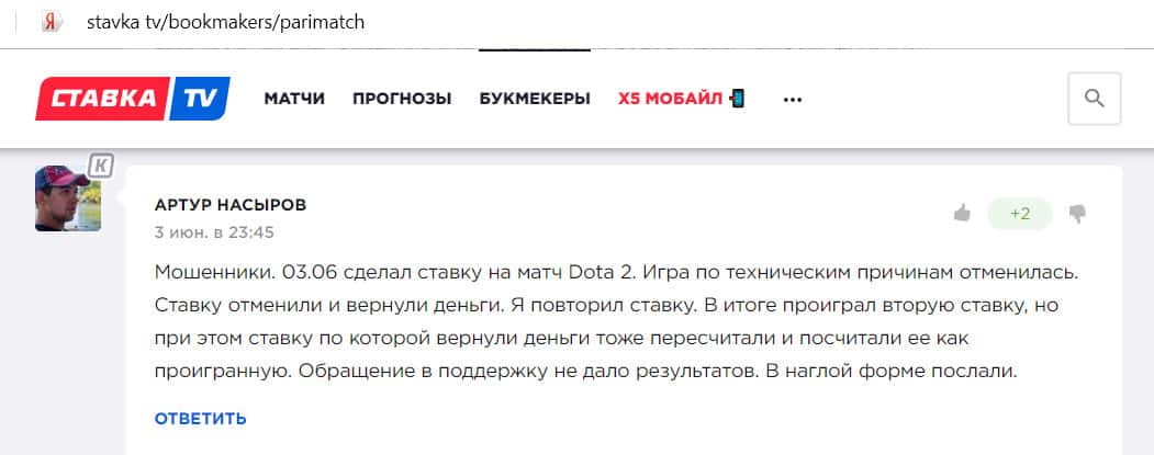 Жалоба о том, что Пари Матч развела клиента примерно на 500 $