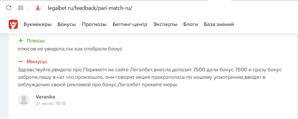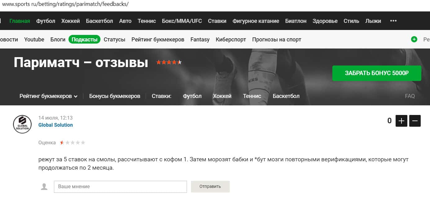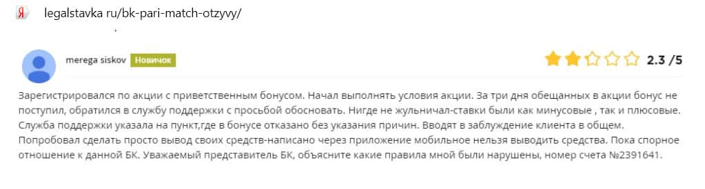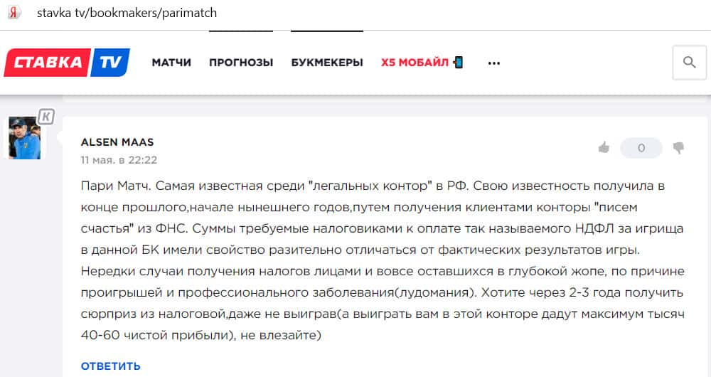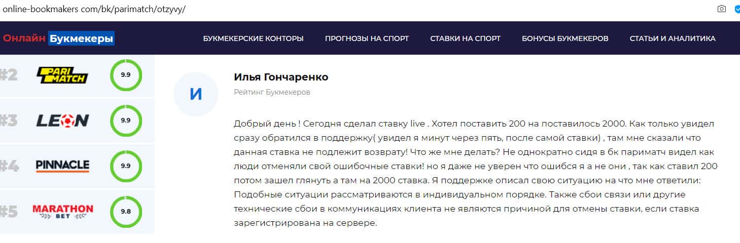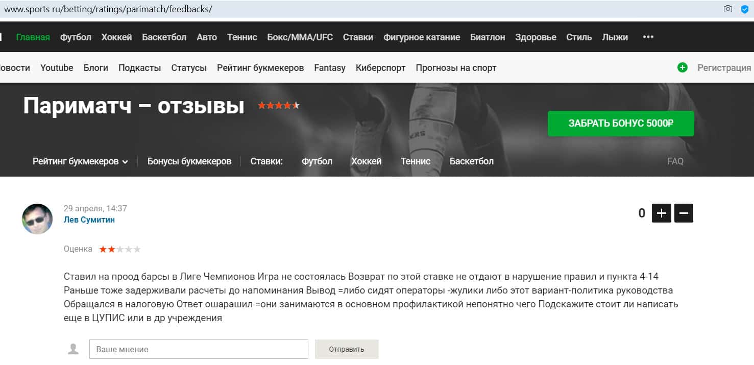 Жалоба о том, что Пари Матч развела клиента примерно на 500 $